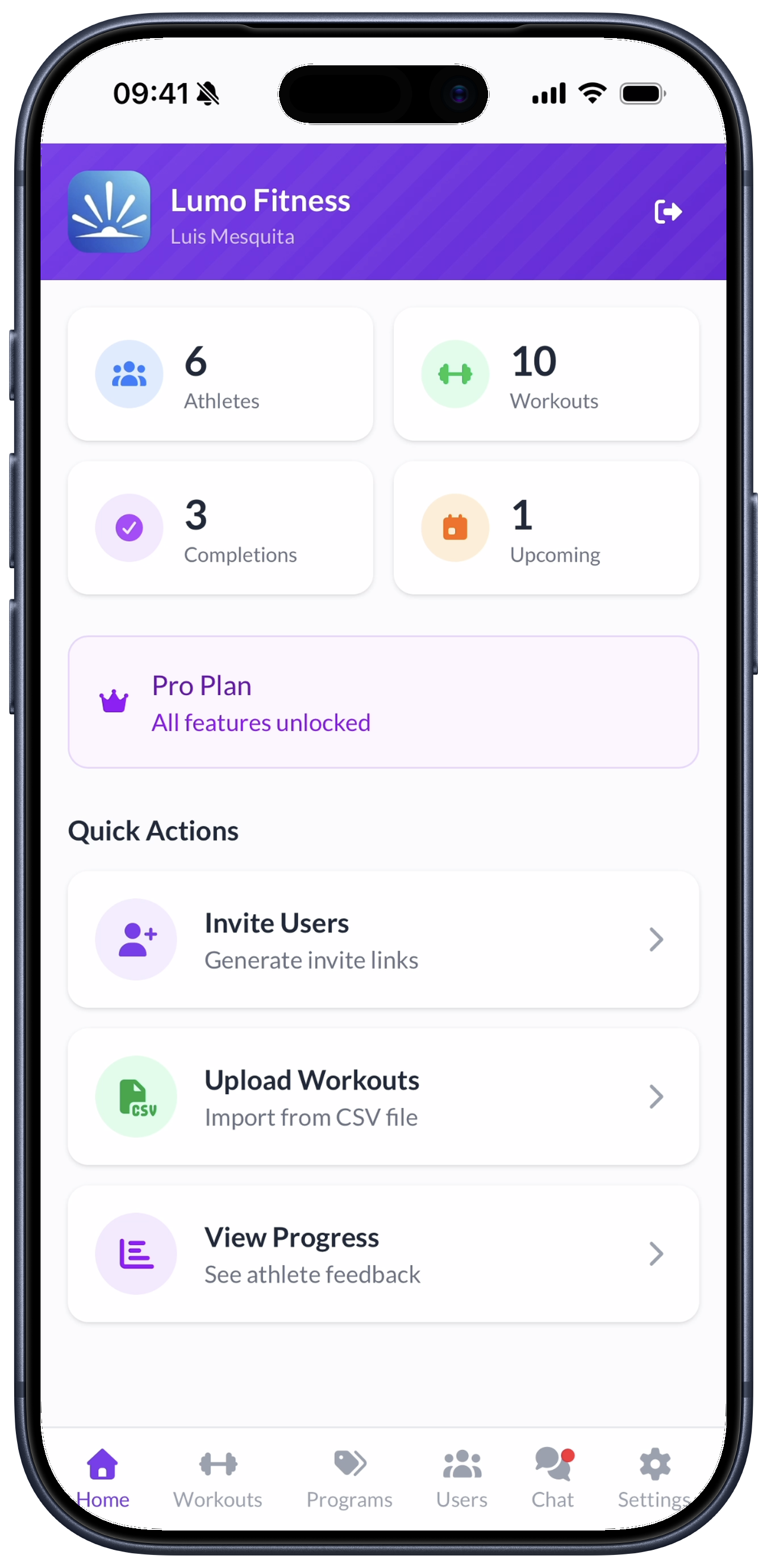 Invite athletes via link. They see their workouts, log completions, and give feedback. Manage unlimited athletes — no caps, no extra fees.